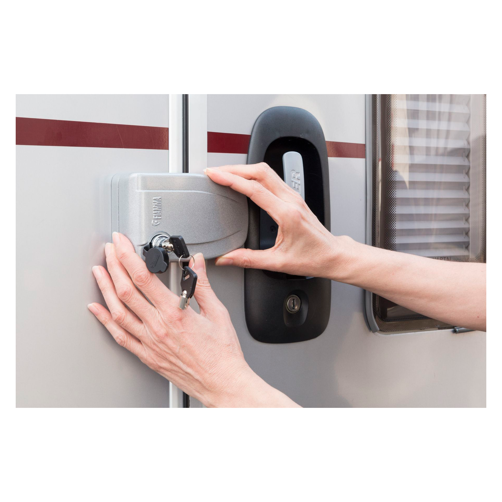 Turvalukko matkailuautojen ja -vaunujen oville, joka peittää myös ulko-oven lukon.