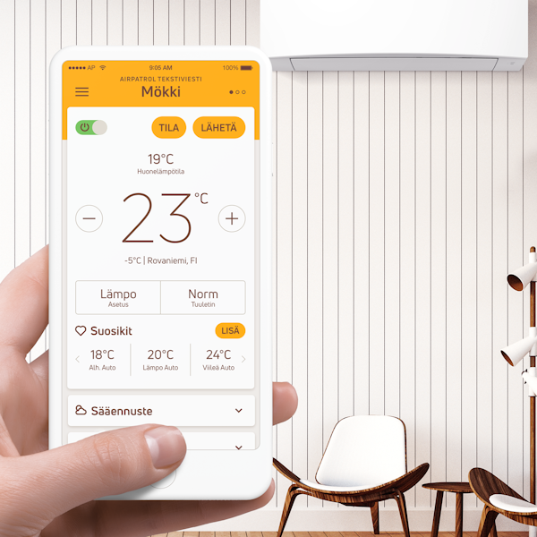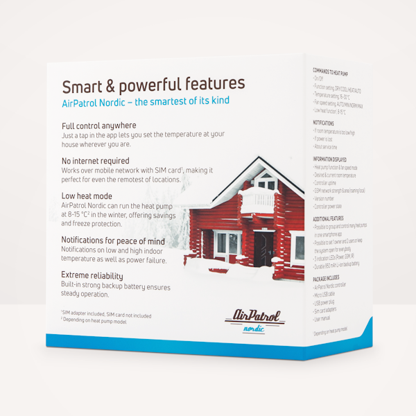 AirPatrol Nordic V2:n avulla saat ilmalämpöpumpusta älykkään ja voit hallita ja tarkkailla vaikka kesämökkisi ilmalämpöpumppua erittäin helposti mistä ja milloin tahansa. AirPatrol-sovellus käyttää tiedonsiirtoon tekstiviestejä 2G GSM -verkossa, eikä näin ollen tarvitse internet-yhteyttä. Laitteen avulla voit tarkastaa vaikka huonelämpötilan ja kosteuden. Lisäksi se ilmoittaa, kun lämpötila laskee alle alarajan tai nousee yli ylärajan. Kauko-ohjain toimii kaikkien Pohjoismaissa myytyjen ilmalämpöpumppujen kanssa.