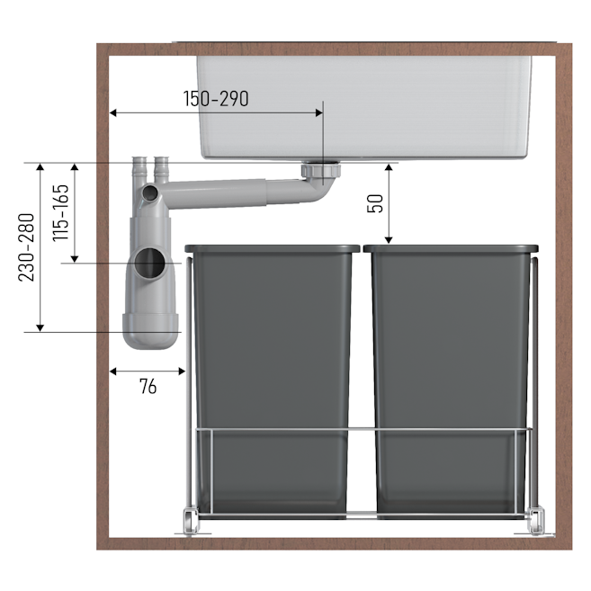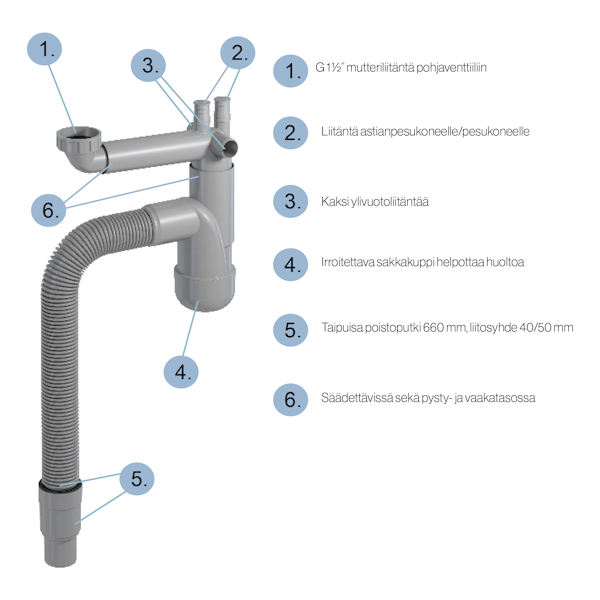 - Kompakti: Flexlocin matala rakenne lisää vapaata korkeustilaa. Vesilukko voidaan asentaa myös allaskaapin takaseinään, jolloin se vie vain 76 mm tilaa. Hyvin kapeissa tiloissa pohjaventtiilit voidaan lyhentää.