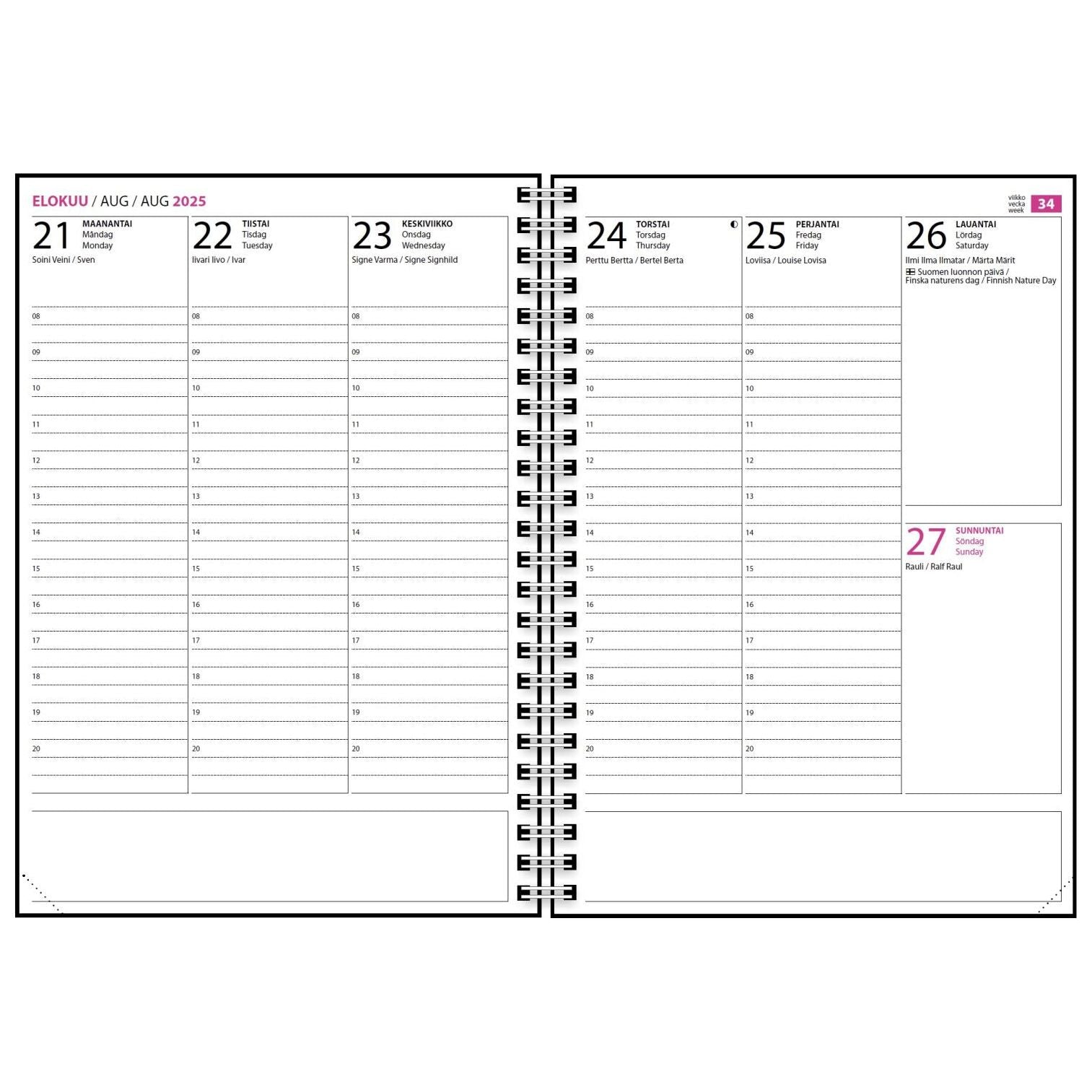 Vallila kalentereissa on upeat designit ja tukevat kartonkikannet parikierresidonnalla. Painatus myös sisäkansissa. Sisältö on 18kk laajuinen viikkoaukeama eli alkaa kesästä 2025 ja päättyy vuoden 2026 loppuun.