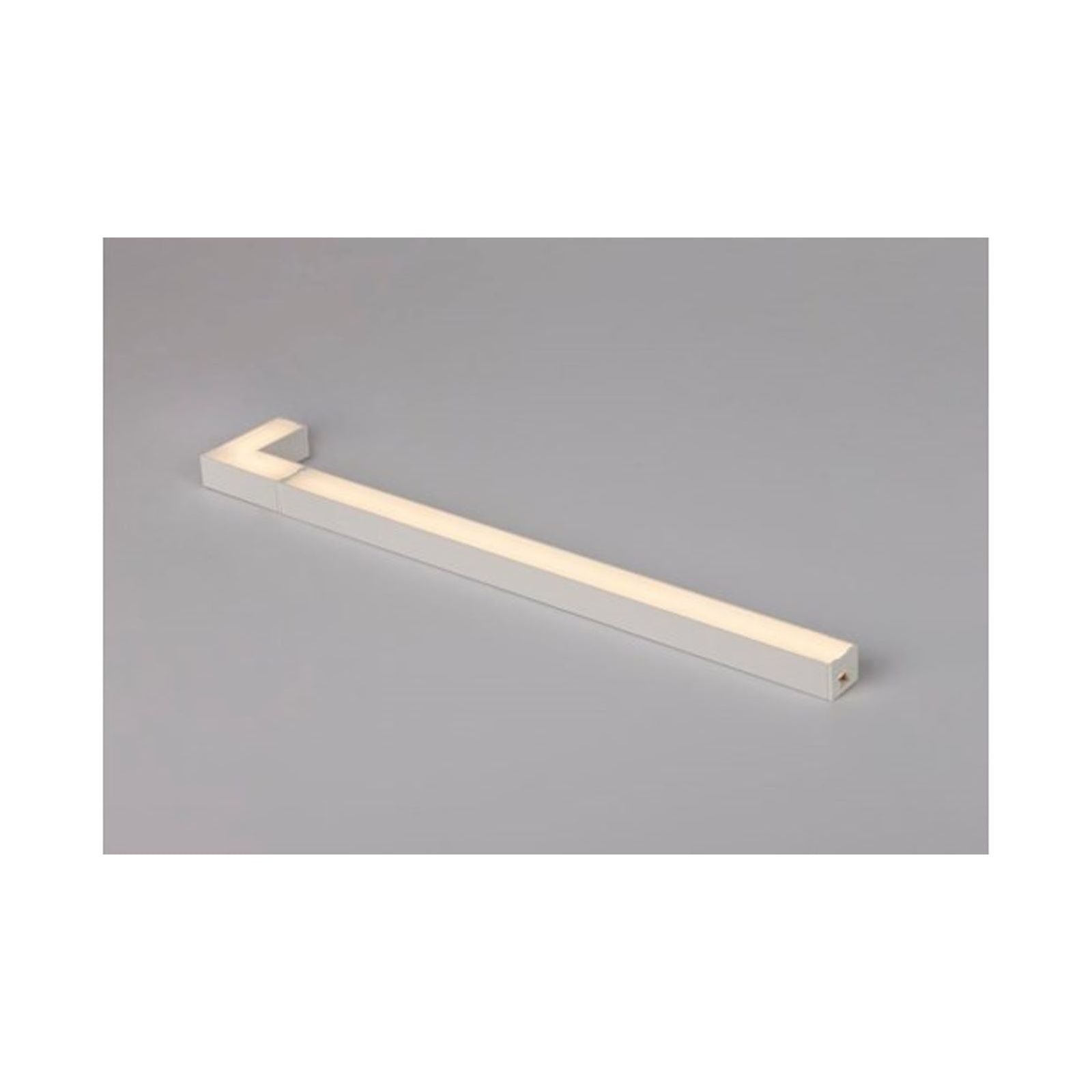 90° kulmaosa, valkoiseksi maalattua alumiinia, suuri valomäärä, hyvä värintoisto ja pisteetön valontuotto. Asennetaan kaksipuolisella teipillä, ruuveilla tai piilokiinnikkeillä. Ihanteellinen vaihtoehto loisteputkille ja alasvaloille yläkaappien alle. Saatavana värilämpötiloilla 2700K, 3000K ja 4000K. Voidaan ketjuttaa 4 metriin asti jatkoliittimellä ja/tai ketjutusjohdoilla. Mukana toimitetaan 2 metrin liitäntäjohto, 25 cm:n ketjutusjohto, jatkoliitin ja kiinnikkeet. Kytketään 24 VDC LED-muuntajaan. Ketjutettava Touch-himmennin saatavana tarvikkeena.