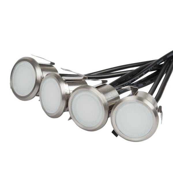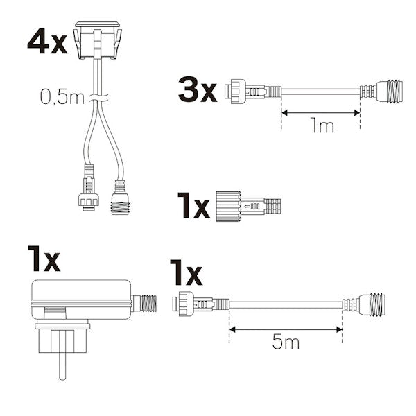 Sarja koristeellisia valaisimia, jotka kuluttavat vähän sähköä ja tuottavat terassille energiatehokkaan valaistuksen. Luomalla ulkovalaistuksella hauskoja tehosteita lisäät myös turvallisuutta talon ympärillä. Mukana 2 kpl 0,5m kumikaapelia ruuviliittimillä. Sarjaan sisältyy 4kpl valaisimia, 3 kpl 1 m jatkokaapeleita pikaliittimellä sekä 1 kpl IP44 plug-in-muuntaja 5 m johdolla. Voidaan käyttää yhdessä Spotlight Gardenin kanssa yhteisen kytkentäjärjestelmän ansiosta.