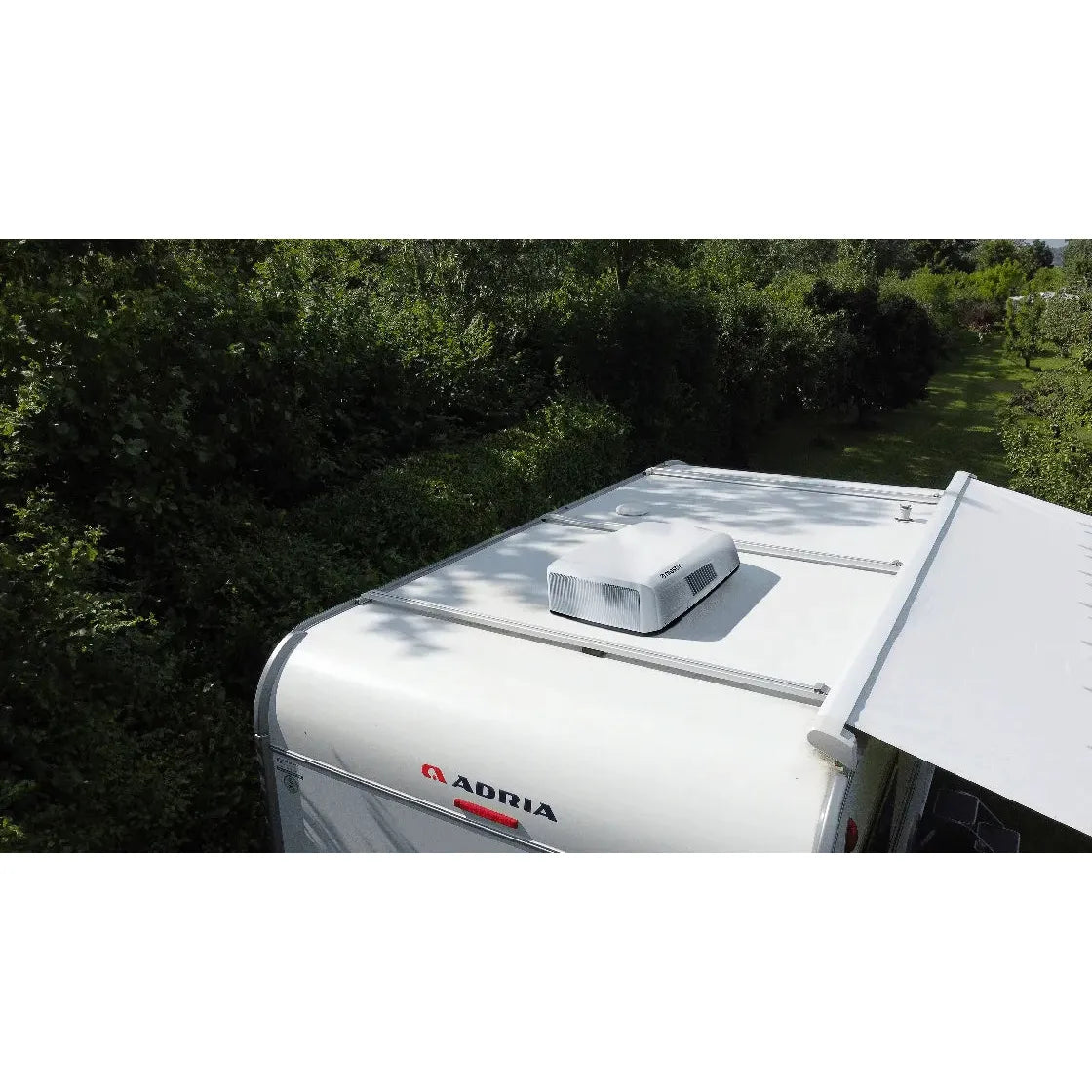Mestic-kattoilmastointilaitteella RTA-2600 voit jäähdyttää, lämmittää tai kuivattaa matkailuautoasi. Tämän matkailuautojen ja asuntovaunujen monitoimisen ilmastointilaitteen jäähdytysteho on 2600 W. Sen 1160 W:n virrankulutuksen ansiosta voit käyttää ilmastointilaitetta myös vähän sulavilla leirintäalueilla. Mukana tulevalla kaukosäätimellä voit helposti säätää kattoilmastointilaitteen lämpötilaan 16 °C - 30 °C. Sisäänrakennettu ilmanjakaja varmistaa, että ilmavirta puhalletaan koko matkailuauton läpi. Ilmastointilaitteessa on myös kosteudenpoistotoiminto. Tämä estää kosteusongelmat, kuten ummehtunut haju tai kondensaatio. Kattoilmastointilaitteen kompaktin koon ansiosta tilaa jää riittävästi aurinkopaneelille tai kattoboksille.