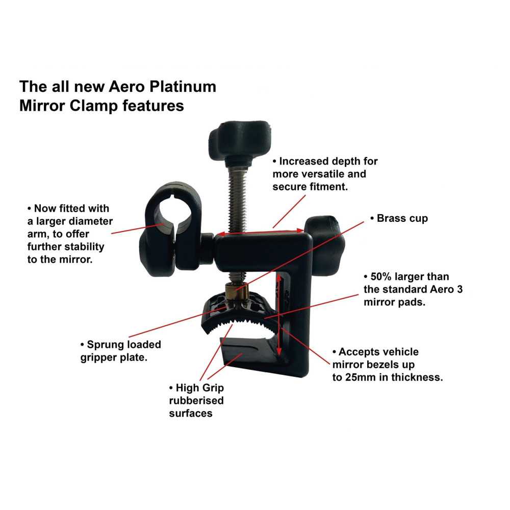 Yksi Aero Platinum Mirrorin tärkeimmistä kehityssuunnista on uusien joustavien, kumipäällysteisten ruostumattomasta teräksestä valmistettujen, jousitettujen tarttujalevyjen sisällyttäminen. Nämä ovat yli 50 % suurempia kuin tavalliset Aero 4 -peilityynyt. Tämä muotoilu mahdollistaa tarraimen "muodostumisen" ajoneuvon peilikehyksen muotoon. Tämä lisää merkittävästi kosketuspinta-alaa, mikä parantaa vetopeilin pitoa ja vakautta. Platinum-kiinnikettä on myös laajennettu, ja se hyväksyy nyt jopa 25 mm:n paksuiset ajoneuvon peilikehykset. Nyt myös halkaisijaltaan suuremmalla varrella varustettuna, tämä tarjoaa vielä enemmän vakautta peilille, ja sillä on riittävä ulottuvuus käytettäväksi jopa 2,55 metriä leveissä asuntovaunuissa.