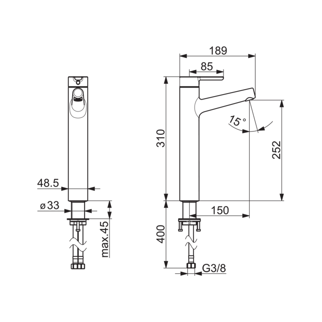 Oras Inspera 3001F on korkea pesuallashana, jossa on kiinteä juoksuputki ja joustavat kytkentäputket.