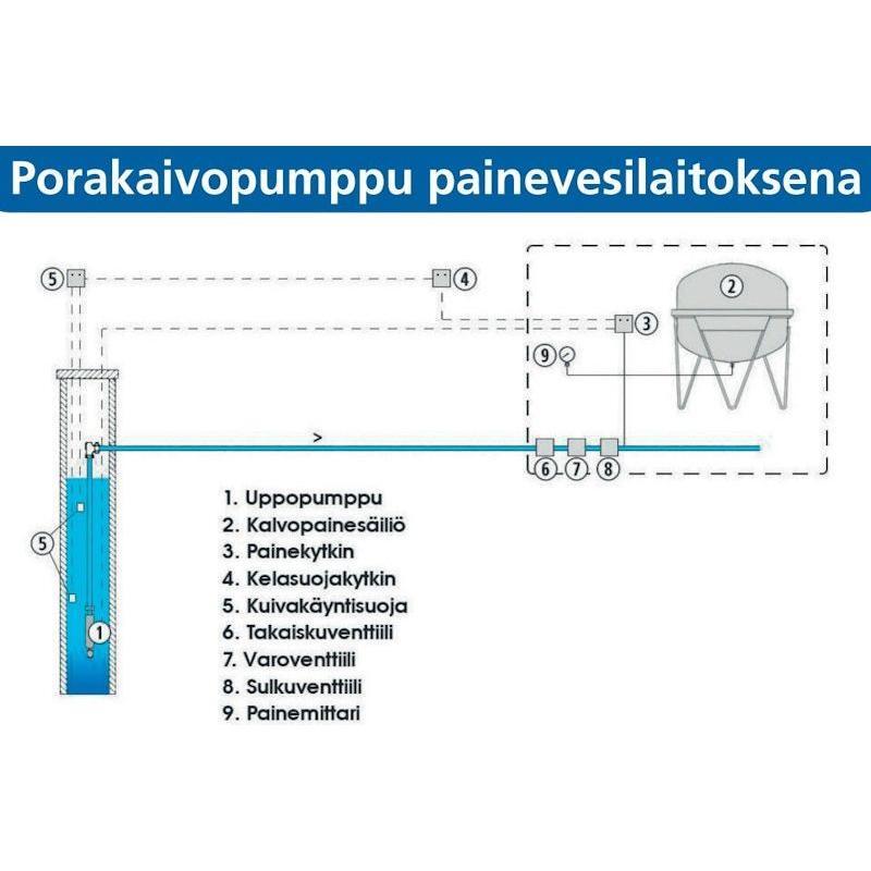 40 m 1-v Uppo-Pyke paketti sisältää valmiiksi mitoitetun upotettavan porakaivopumpun ja kaapelin. Nostovaijeri on saatavana lisävarusteena.