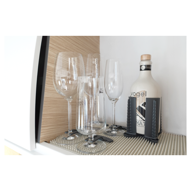 Yhdessä koristellun levyn kanssa IVY-lasitelinettä voidaan käyttää missä tahansa laatikossa, säilytyslokerossa, säilytyslaatikossa, lääkekaapissa ja paljon muualla, jolloin lasit voidaan kuljettaa pystyasennossa. Se tarjoaa