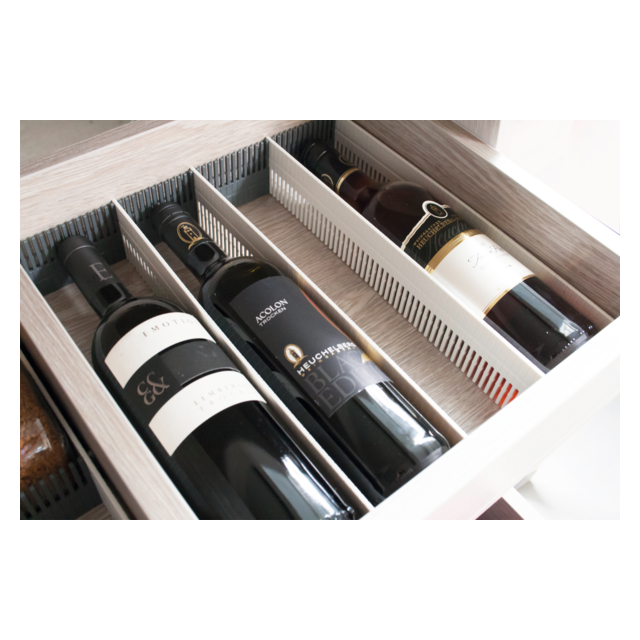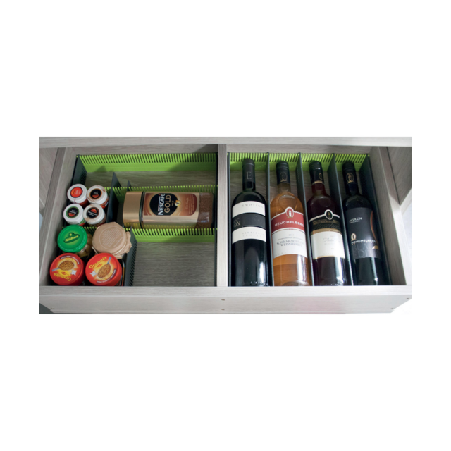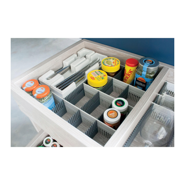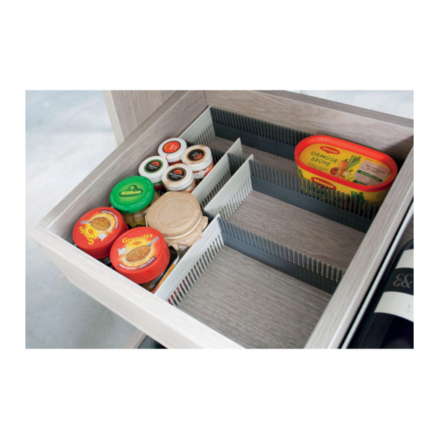 koostuu 8 säilytyslistasta, jotka luovat muunneltavan lokeron. Pitkät ja leveät, joustavasta muovista valmistetut tangot tarjoavat optimaalisen erottelusuojan eri tavaroille ja vakauttavat siten tavarasi särkymättömästi ja liukumatta. Säilytyslistan yläosassa on useita piikkejä, jotka työnnetään yhteen luoden vakaan ja turvallisen liitoksen. Piikkien tiivis etäisyys mahdollistaa joustavan säätämisen lähes mille tahansa etäisyydelle. Äärettömän monipuolinen! Muita käyttömahdollisuuksia: keittiössä, toimistossa, työpajassa tai harrastehuoneessa.