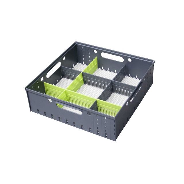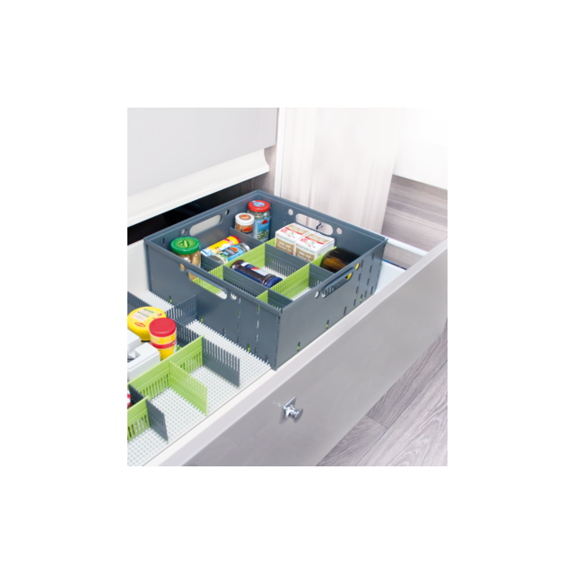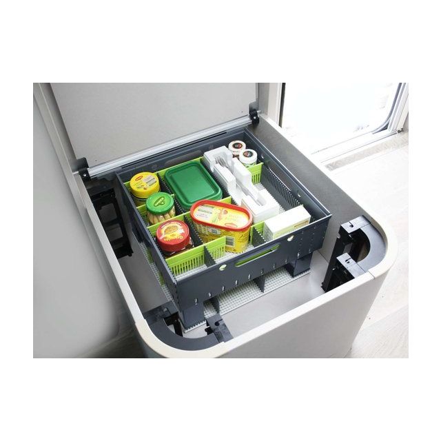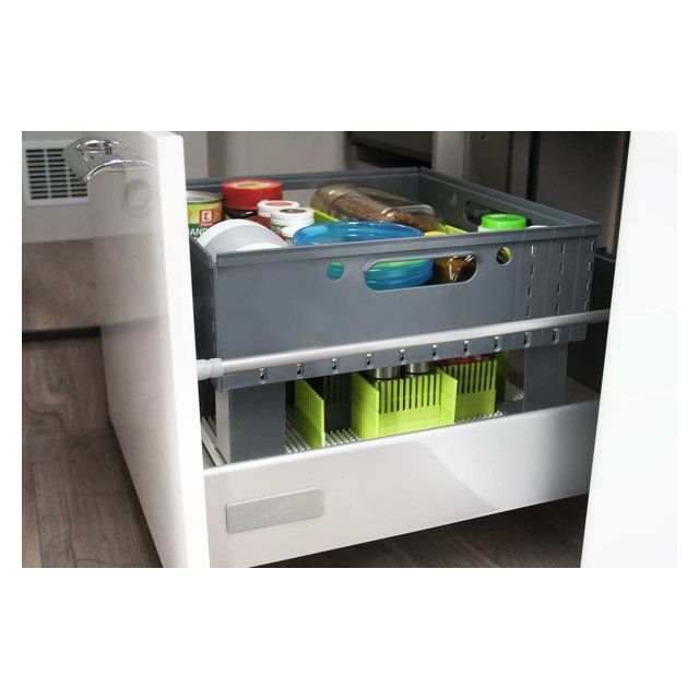 Sisältää neljä säilytyskiskoa , jotka sopivat tarkasti tukilevyyn. Napsauta vain kiinni. Pohjalevyä ja säilytyskiskoja voidaan lyhentää rei'itystä pitkin (5 mm:n välein). Sivuseinien leveyttä voidaan lyhentää (rei'ittää) noin 260 mm:iin, joten saatavilla on kolme kokoa (340 mm, 300 mm, 260 mm).