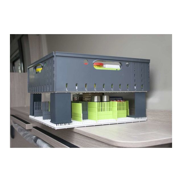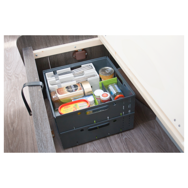 Vihdoinkin järjestys. Mikään ei riko, mikään ei kolise. Pinottavat, tukevat ja nopeasti pakattavat laatikot tarjoavat tilaa monille tavaroille – ruoalle, laseille ja paljon muulle – ja sopivat erinomaisesti myös aidolle lasille. Valtava etu: