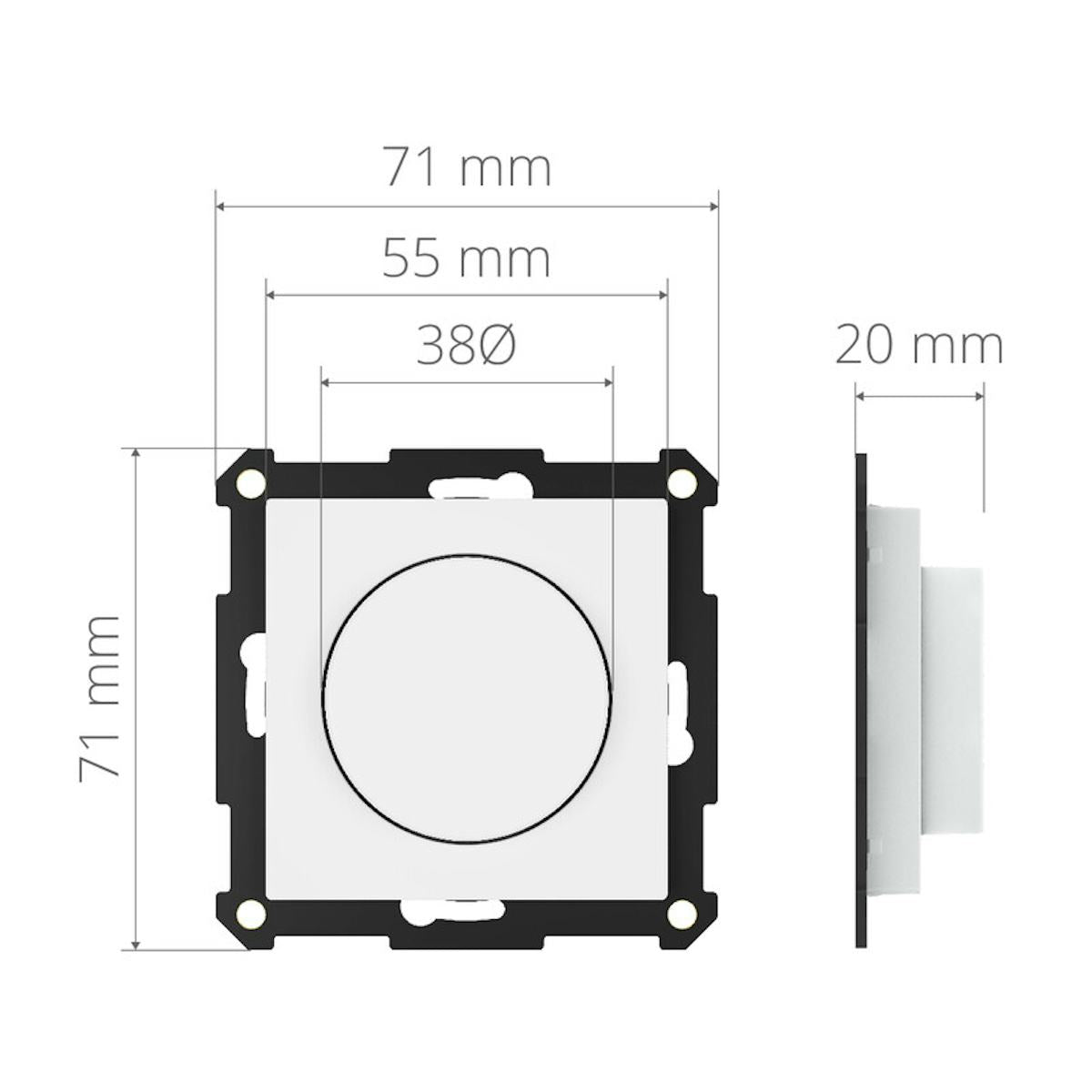 • mitat: 71x71x14 mm, keskiölevy 55x55 mm, halkaisija Ø 38 mm