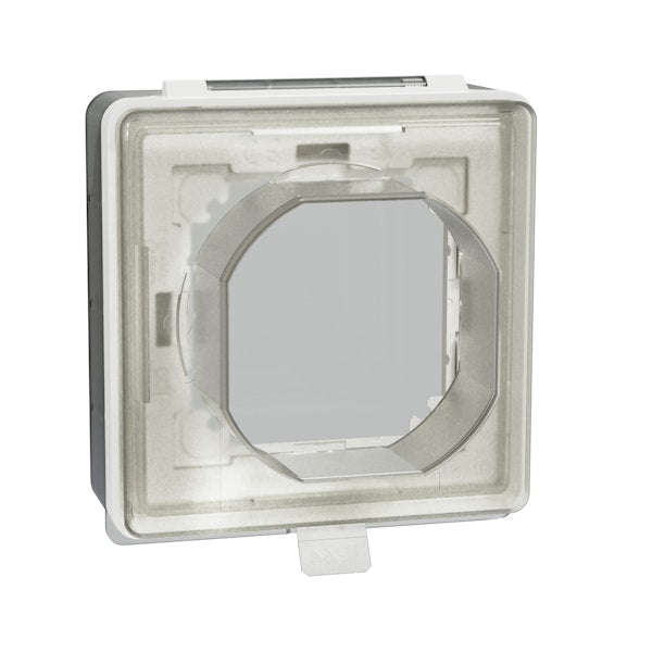 Exxact IP44 yleiskäyttöinen suojakansi Exxact IP44 suojakansi mahdollistaa erityisesti elektroniikkatuotteiden käytön, märissä tai kosteissa tiloissa. Soveltuu max. 24mm korkeille tuotteille. Suojakantta voidaan käyttää uppo- ja pinta -asennukseen ja keskiölevyltään 55 x 55 mm ja 71 x 71 mm tuotteille. 71 x 71 mm tuotteiden osalta kehyksen adapteri poistetaan. Kotelon mukana toimitetaan IP44 tiiviste.