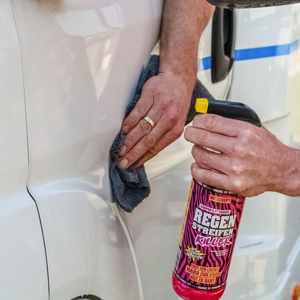 Rain Streak Killer on tehokas erikoispuhdistusaine pinttyneelle lialle, kuten sadeviiroille, patinalle tai värjäytyneille tiivisteille. Se on turvallinen kaikille yleisille ajoneuvojen pinnoille, ei vahingoita materiaalia ja on likaa hylkivä Xtra Skin -efektinsä ansiosta. Ihanteellinen asuntovaunuihin, veneisiin tai matkailuautoihin – suihkuta vain, anna vaikuttaa, pyyhi pois ja olet valmis.