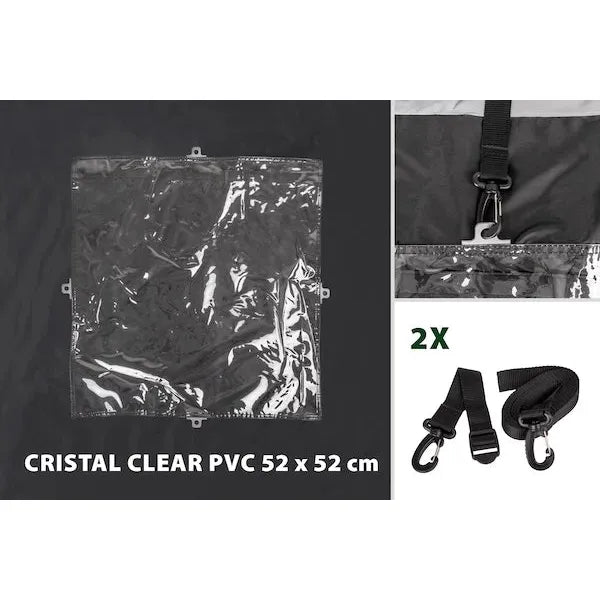 Laadukas polkupyörän suojus vetokoukussa olevalle polkupyörätelineelle. Valmistettu kestävästä ja vedenpitäväksi pinnoitetusta polyesterikankaasta. Lisäturvaa antavat erilaiset kiristyshihnat, jotka estävät suojuksen liiallisen lepatuksen kovassa tuulessa. Läpinäkyvä tasku varoitusmerkille. Mukana säilytyspussi. Saatavana 2 versiota: 2 ja 4 pyörälle.
