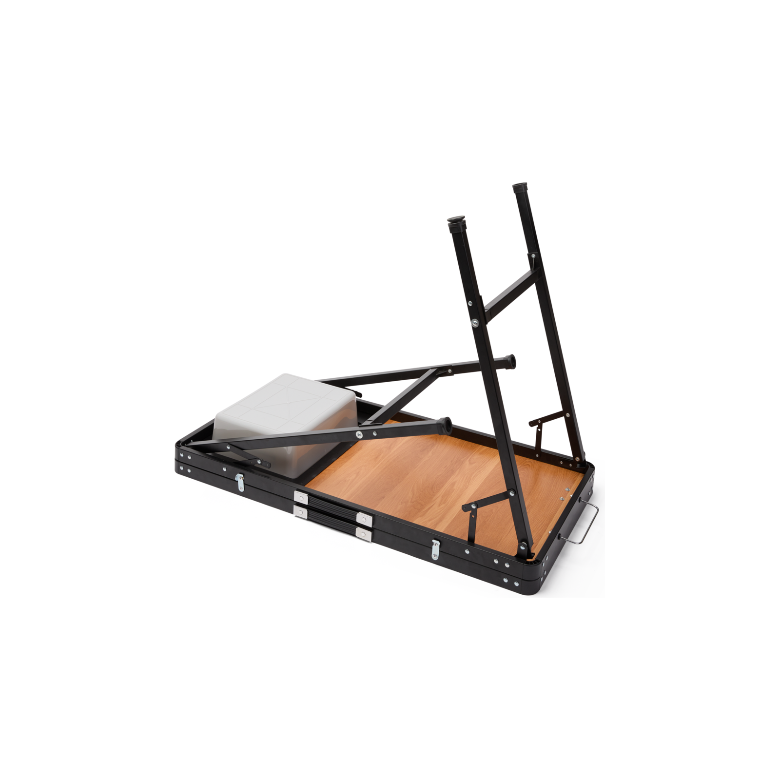 Keittiölaatikossa on kaksi toisistaan erillään olevaa ja vetoketjulla suljettavaa lokeroa. Näissä kahdessa lokerossa on myös välipohja, joka jakaa osaston kahteen tasoon. Lisäksi laatikossa on integroitu allas, suuri 100 x 50 cm työtaso, kaksi ripustettavaa maustehyllyä kannessa sekä koukut keittiövälineiden tai pyyhkeiden ripustamista varten. Avattu kansi toimii myös tuulensuojana ruoanlaittoa varten.