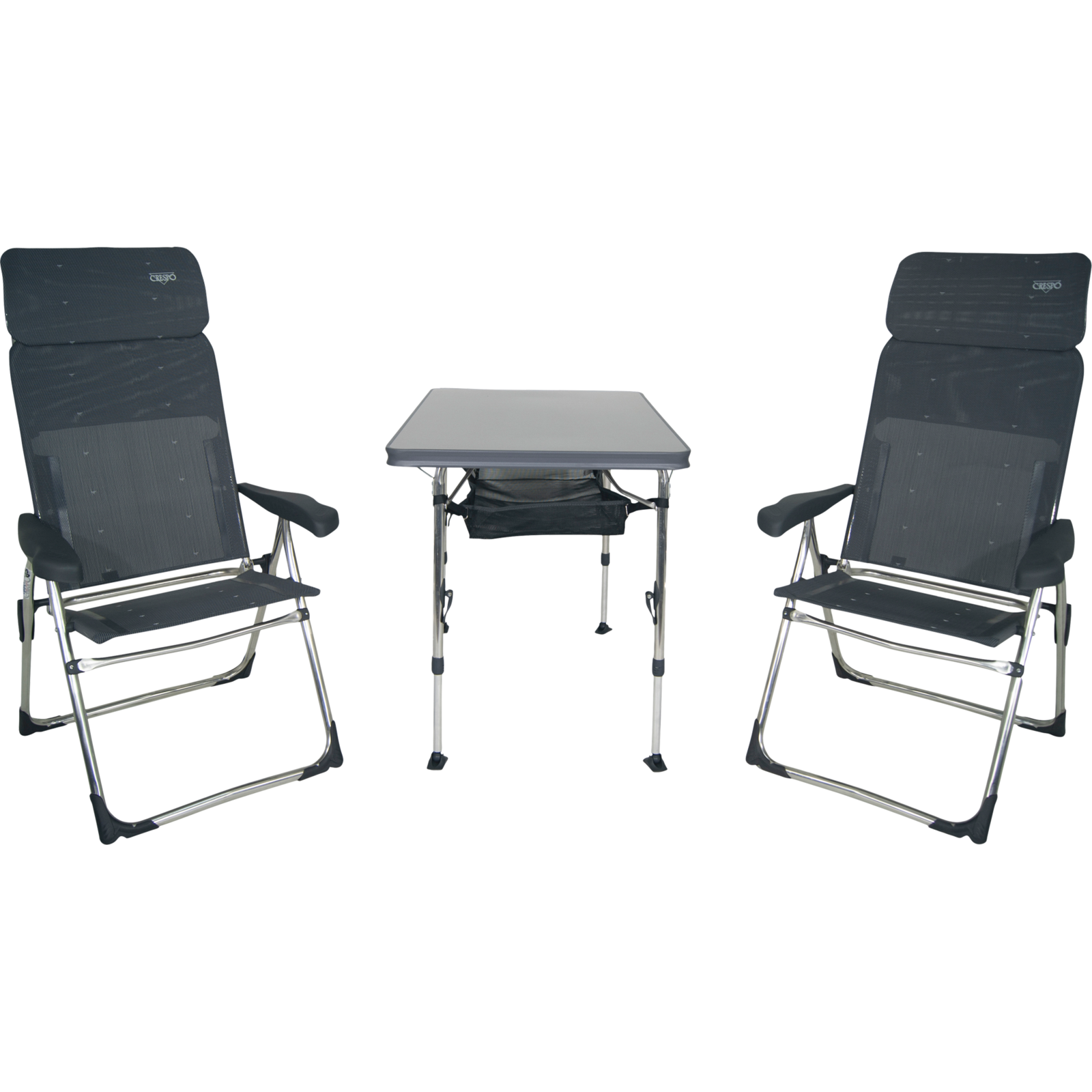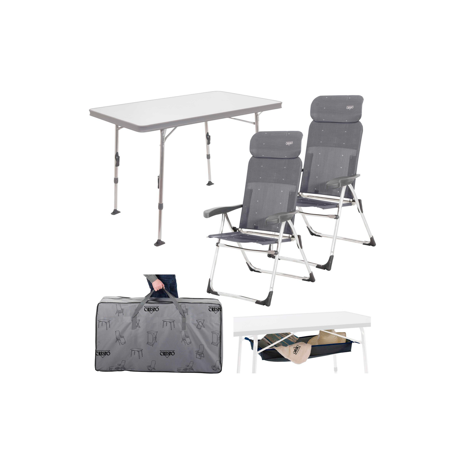 Tämä Crespon täydellinen setti on täydellinen varuste kahdelle hengelle. Se sisältää kaksi erittäin pienikokoista tuolia, tukevan ja säänkestävän pöydän, säilytysverkon ja käytännöllisen kantolaukun. Joten kaikki mitä tarvitset viihtyisään kokoontumiseen on siellä, kätevästi ja kätevästi säilytettynä laukussa. Pienen pakkauskokonsa ja keveytensä ansiosta tämä sarja sopii erinomaisesti pakettiautoihin ja pakettiautoihin.