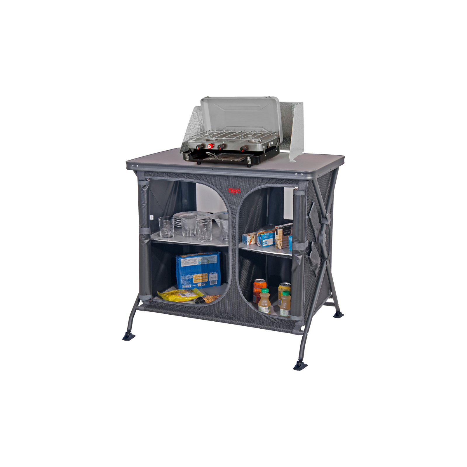 Valmistettu kevyestä ja tukevasta alumiinirungosta, jossa on antrasiitinvärinen epoksipinnoite. Siinä on hyttysverkko takapaneelissa ja itsestään tasoittavat tukijalat. Siinä on suuri vetoketjullinen aukko ja neljä säilytyslokeroa sisällä. Lisäksi ulkopuolella on taskuja käytännöllisyyteen. Mukana kantolaukku (100 % polyesteriä).