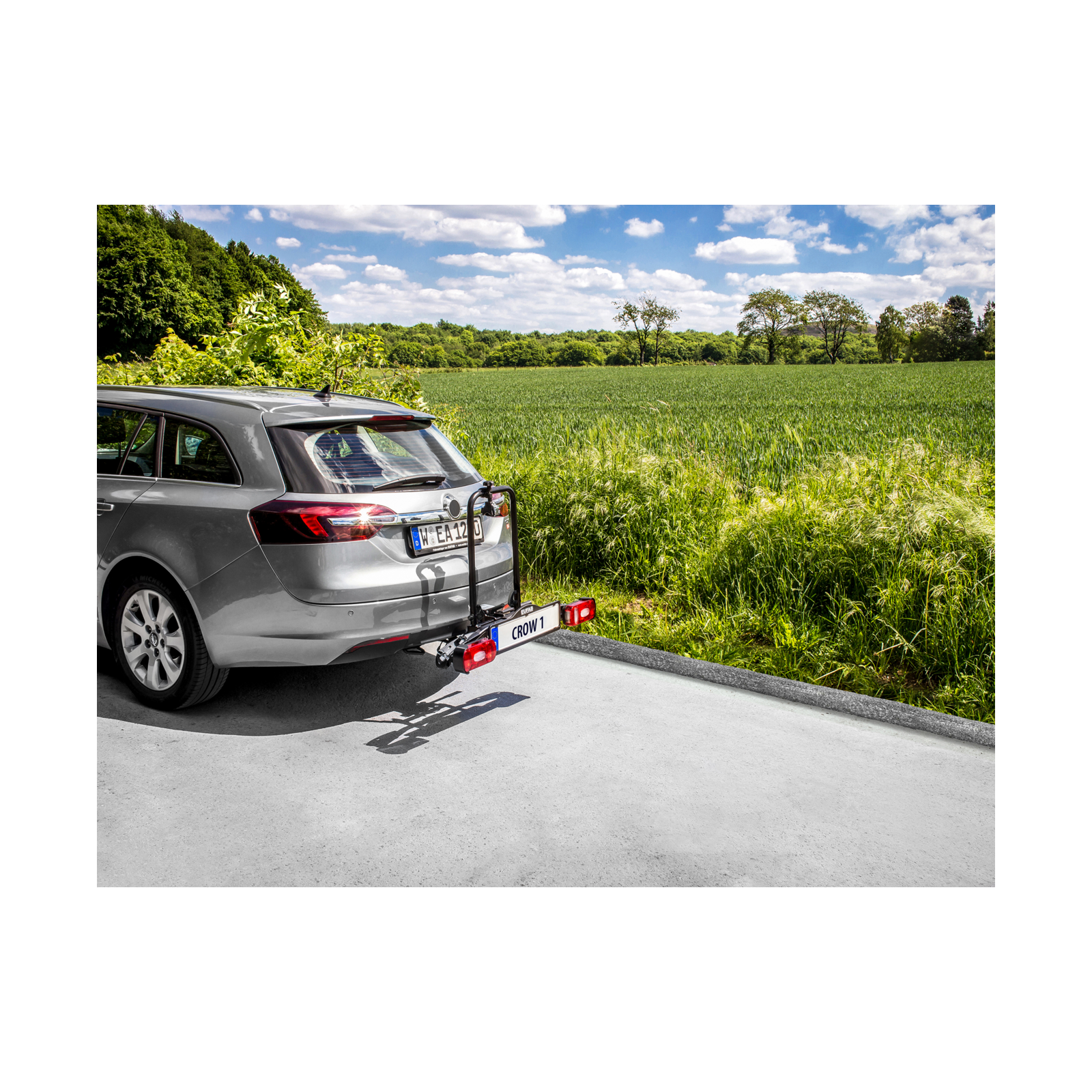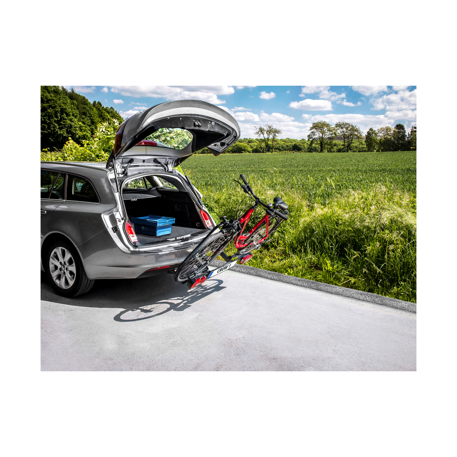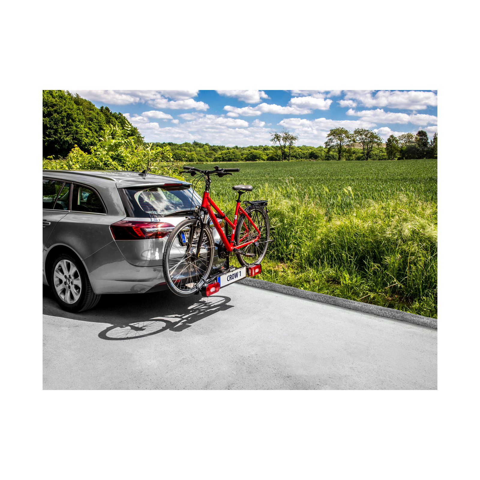 Yhden polkupyörän kuljettamiseen peräkärryn vetokoukussa, lukittava pikalukolla ja taittomekanismilla. 30 kg:n hyötykuorman ansiosta teline sopii myös sähköpyörille.