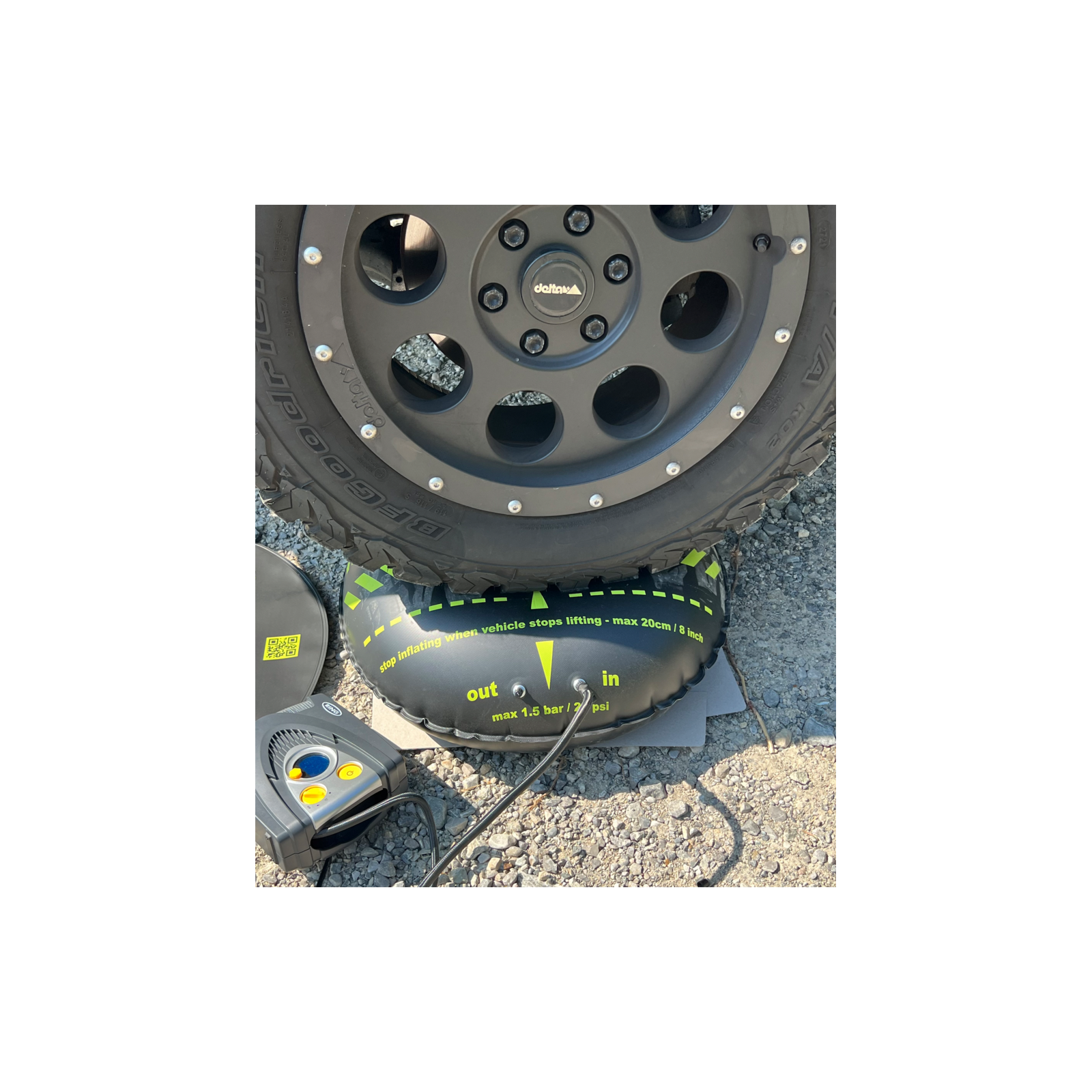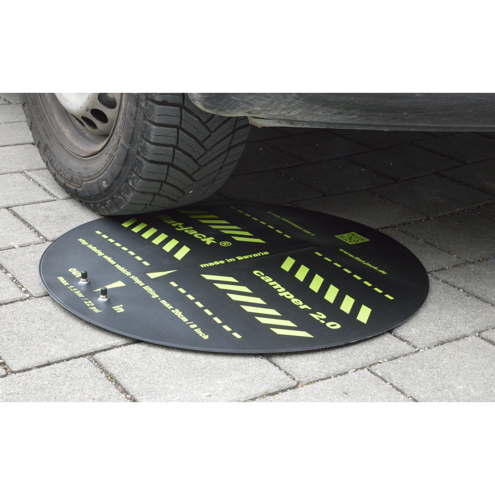 Leirintäalueelle saapuessa usein alkaa työläs prosessi: ajoneuvon nostaminen ylös, tukeminen ja vakauttaminen tasauskiiloilla, tukijärjestelmillä tai kammen tunkeilla. Jopa silloin pesualtaan ja suihkun vesi on usein vain puoli senttimetriä liian kaukana asianmukaisesta valumisesta. Se on historiaa! Uuden Camper 2.0 -renkaan ilmatyynyn avulla voit helposti nostaa jopa 6 tonnia painavia ajoneuvoja jopa 20 senttimetriä. Täytä se vain jalkapumpulla tai minikompressorilla, puhdista maa terävistä esineistä tai suojaa se ja peitä se, jos se altistuu voimakkaalle auringonvalolle.