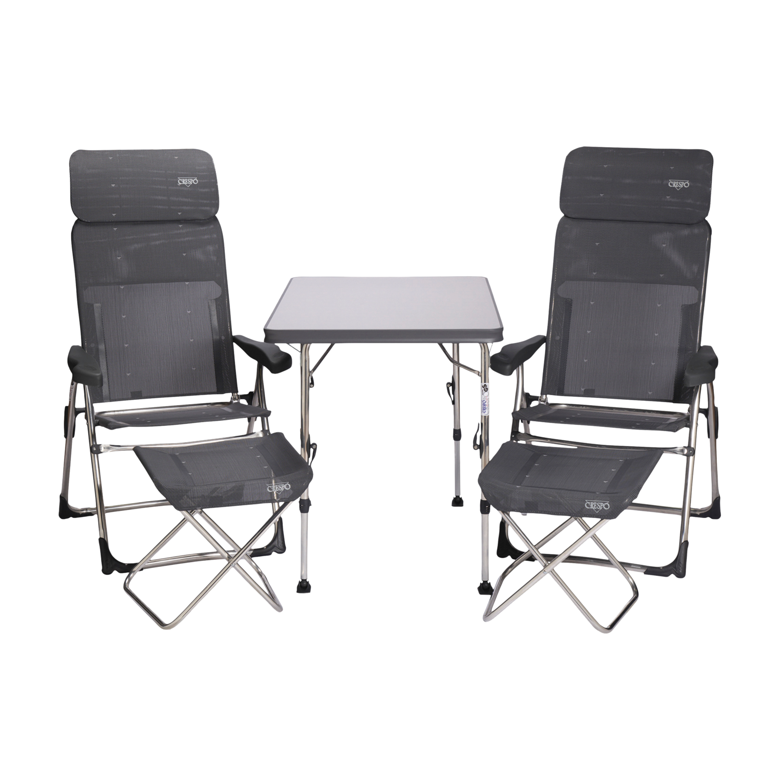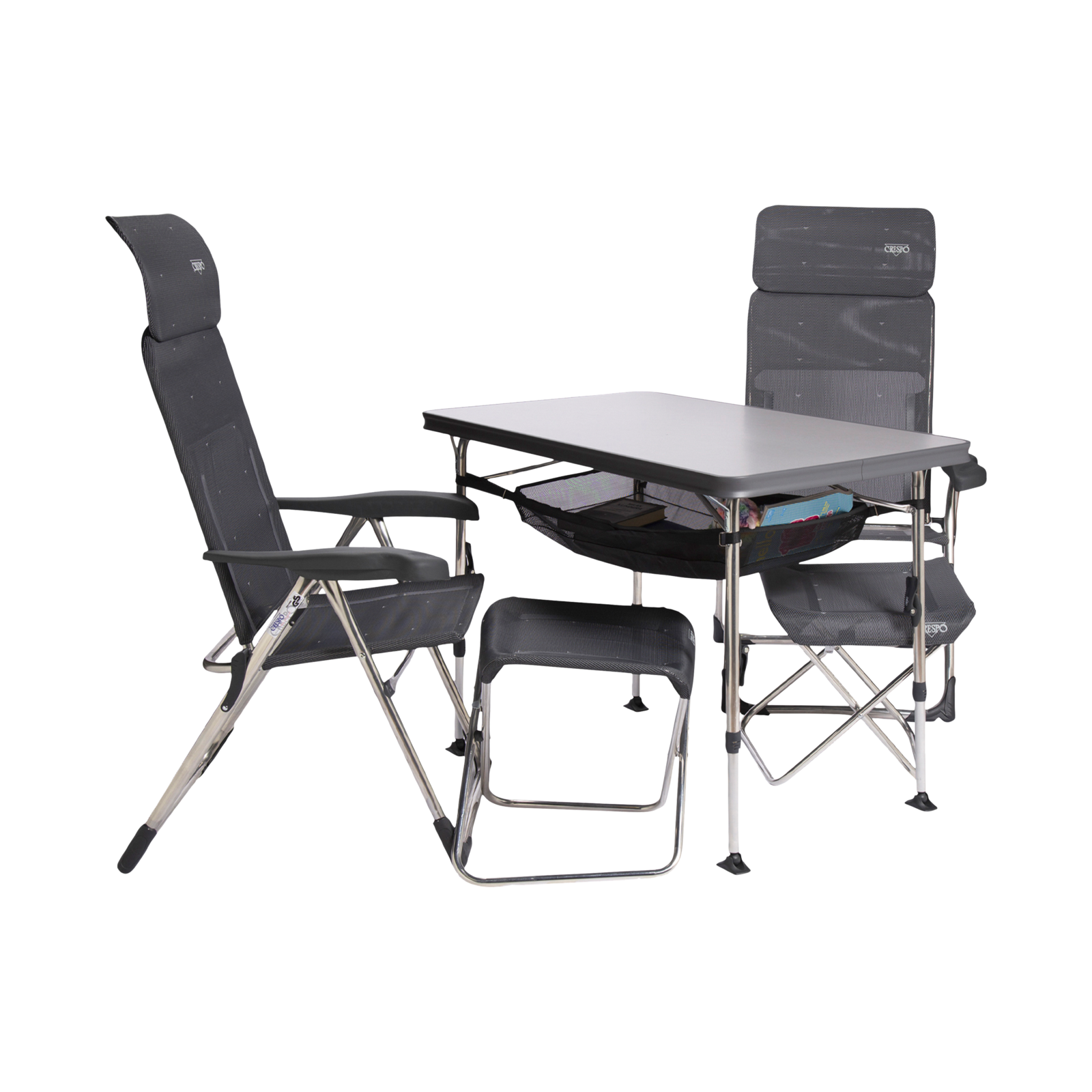 Kompakti 213 CTR -setti, joka koostuu korkeussäädettävästä pöydästä säilytysverkolla, yhteensopivista tuoleista jalkatuineen ja kestävästä säilytyslaukusta, sopii täydellisesti pienempiin matkailuautoihin ja -vaunuihin. Ylellinen AL-246-retkipöytä on varustettu kuumuutta ja vettä kestävällä melamiinista valmistetulla pöytälevyllä ja kestävällä pulverimaalatulla alumiinirungolla. Siinä on jatkuvasti säädettävät jalat (59–76 cm), jotka voidaan kiinnittää pikalukolla. Itsetasoittuvat tukijalat takaavat optimaalisen tuen aina, myös epätasaisessa maastossa. Jalat voidaan helposti taittaa kokoon yhdellä kädellä, mikä tekee pöydästä mukavan kuljettaa ja vain 4 cm paksuisena se on erittäin tilaa säästävä. Pöydän alla oleva suuri verkko sopii erinomaisesti sanomalehtien, aikakauslehtien, puhelimen tai muiden tarvikkeiden säilyttämiseen.