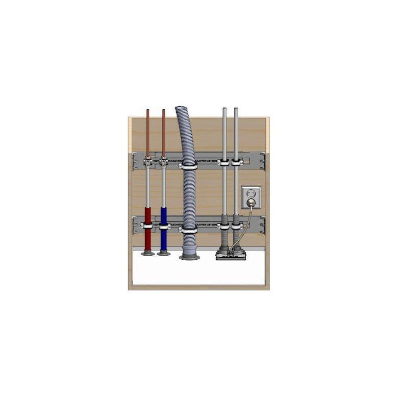 Allaskaappiin asennettavien putkien kannakointilevy. Putket kiinnitetään kannakein kannakointilevyyn, kannakeita ei tarvitse kiinnittää pinkopahvin takana olevaan seinään eikä kylpyhuoneessa kaakeliseinään.