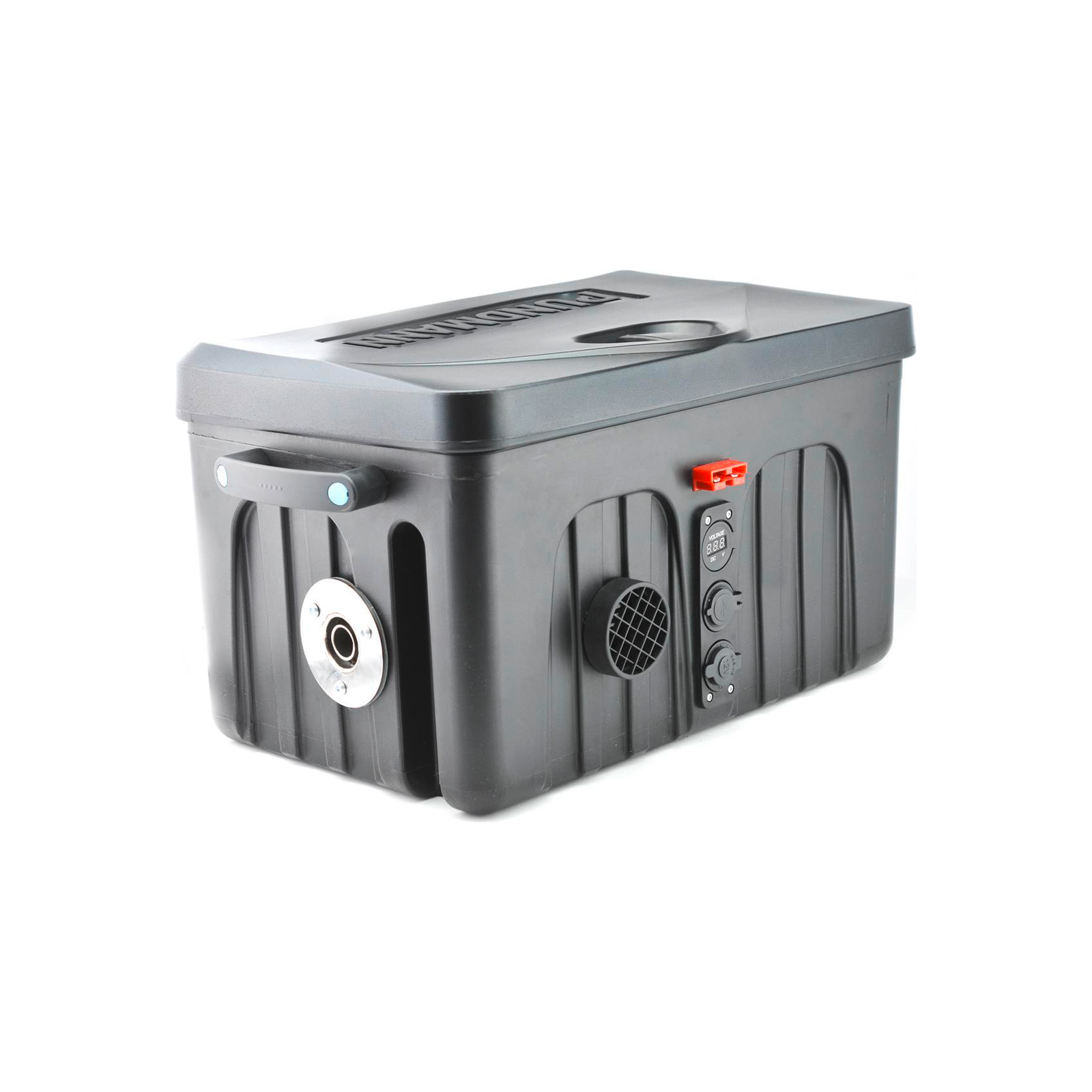 2 kW lisälämmitin (1,8 kW lämmitysteho) kiertosäätimellä, kaukosäädin, 5 litran dieselsäiliö (20–50 tuntia lämmityskäyttöä), kokonaispaino 17 kg. Anderson-pistoke akun lataamiseen, USB-liitäntä ja autolaturi.