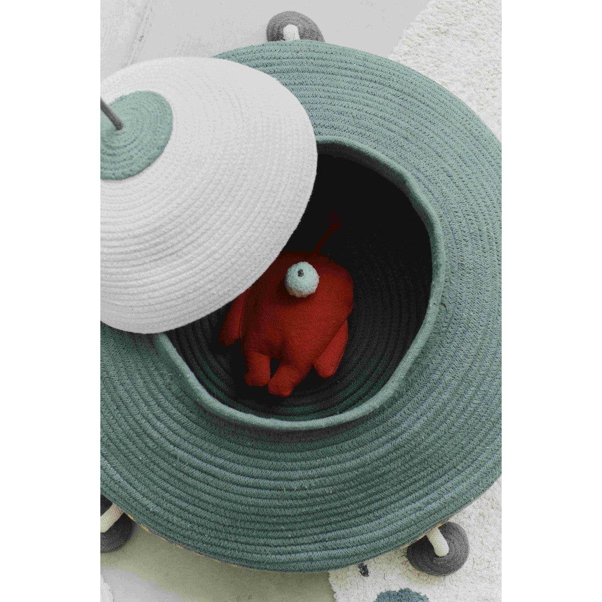 Tämä suuri, käsintehty kori on UFOn muotoinen ja valmistettu puuvillanaruista, jotka on täytetty kierrätetyillä PET-materiaaleilla. Siinä on liikuteltavat jalat täydellistä laskeutumista varten, naruantenni signaalien vastaanottamiseen galaksin kaukaisimmista kolkista ja suuri kapasiteetti kuljettaa kokonaisen miehistön leluja, kirjoja tai muita avaruusaarteita pienen tutkimusmatkailijasi löydettäväksi!