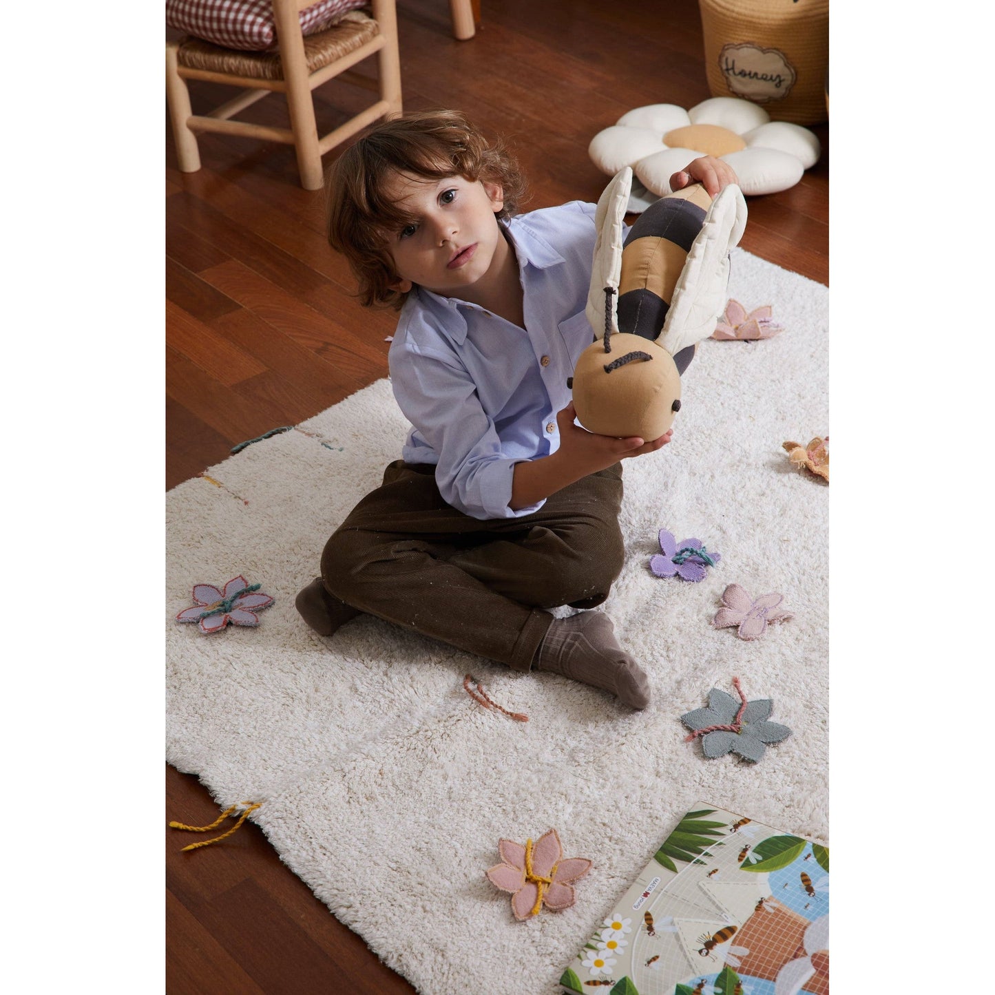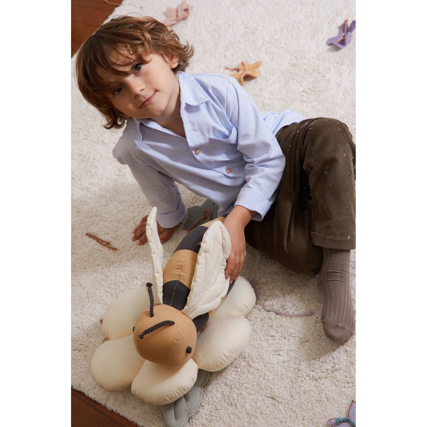 Tunne itsesi mehiläiseksi! Mukava Buzzy Bee -tyyny on valmistettu pehmeästä hunajanvärisestä puuvillapopliinista, jossa on tummanharmaat raidalliset laikut ja pehmeästi topatut luonnonväriset siivet.