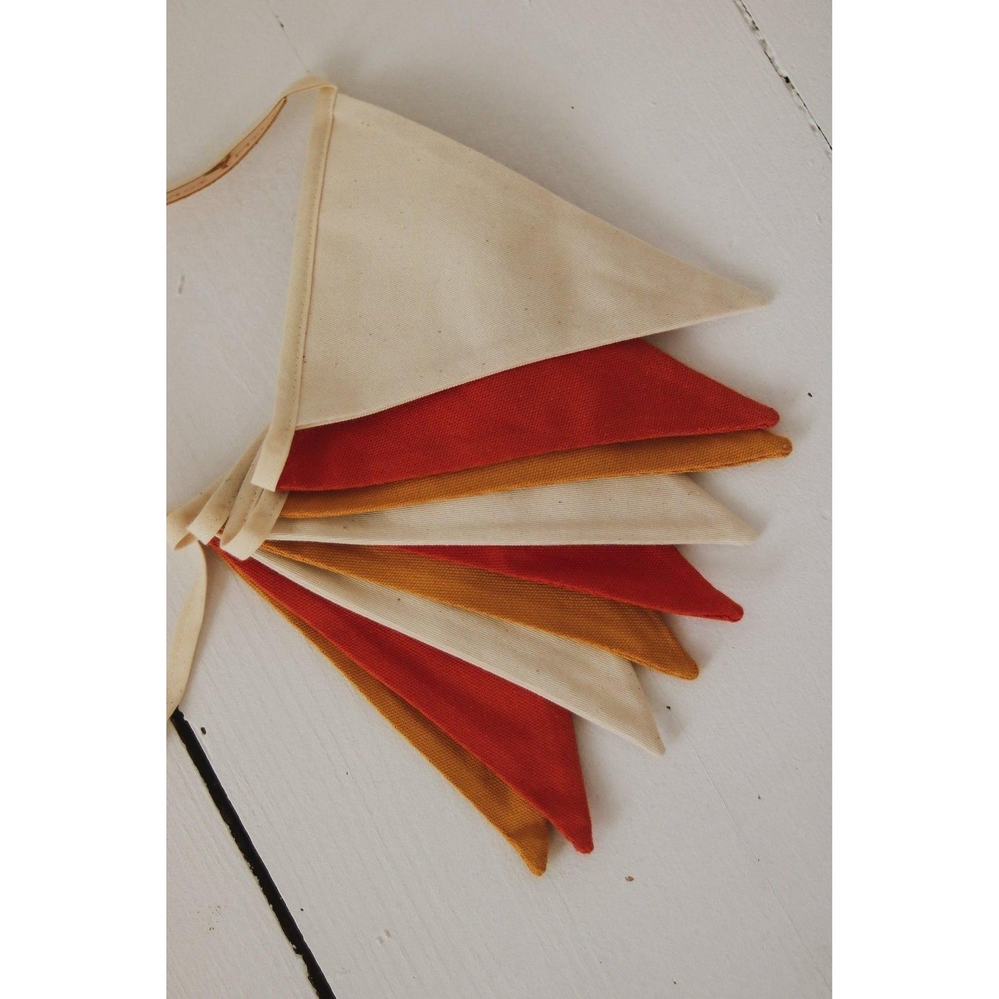 Seppele on huolellisesti tehty puuvillaviireistä (valkoinen, hunajainen, punainen) ja ommeltu nauhalle.
