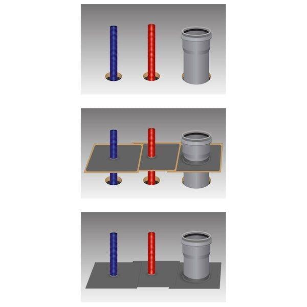 ASKARI-tiivistesarja sisältää kolme läpivientikaulusta; kaksi kaulusta käyttövesiputkille ja yksi kaulus viemäriputkelle. Kauluksissa on valmis silikonipaperilla suojattu liimapinta, joten ne voidaan kiinnittää alustaansa ilman tiivistysteippiä.