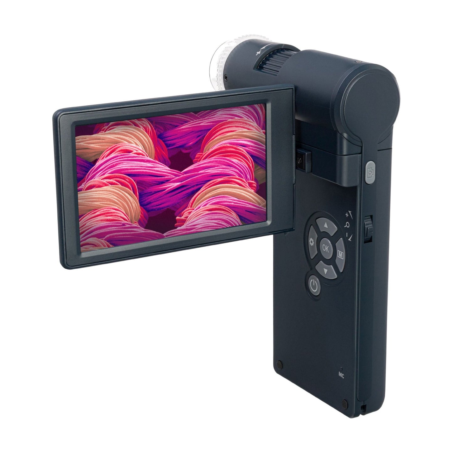 Mikroskoopissa on 4 tuuman värillinen LCD-näyttö, jota voidaan kääntää. Objektiivin alla oleva kuva näkyy ruudulla reaaliajassa. Mikroskoopilla voidaan ottaa kuvia ja tallentaa videoita korkealla resoluutiolla. Muistikortti tarvitaan, joka ostetaan erikseen. MicroSD-kortteja, joiden kapasiteetti on enintään 32 Gt, tuetaan. Tarvittaessa mikroskooppi voidaan liittää ulkoiseen laitteeseen: näyttöön, televisioon tai tietokoneeseen. Kaikki tarvittavat kaapelit sisältyvät jo pakkaukseen. Ennen kuin liität mikroskoopin tietokoneeseen, älä unohda asentaa mukana toimitettu ohjelmisto. Se antaa sinulle pääsyn laajennettuihin ominaisuuksiin ja mahdollistaa kohteiden lineaari- ja kulmakokojen mittaamisen.