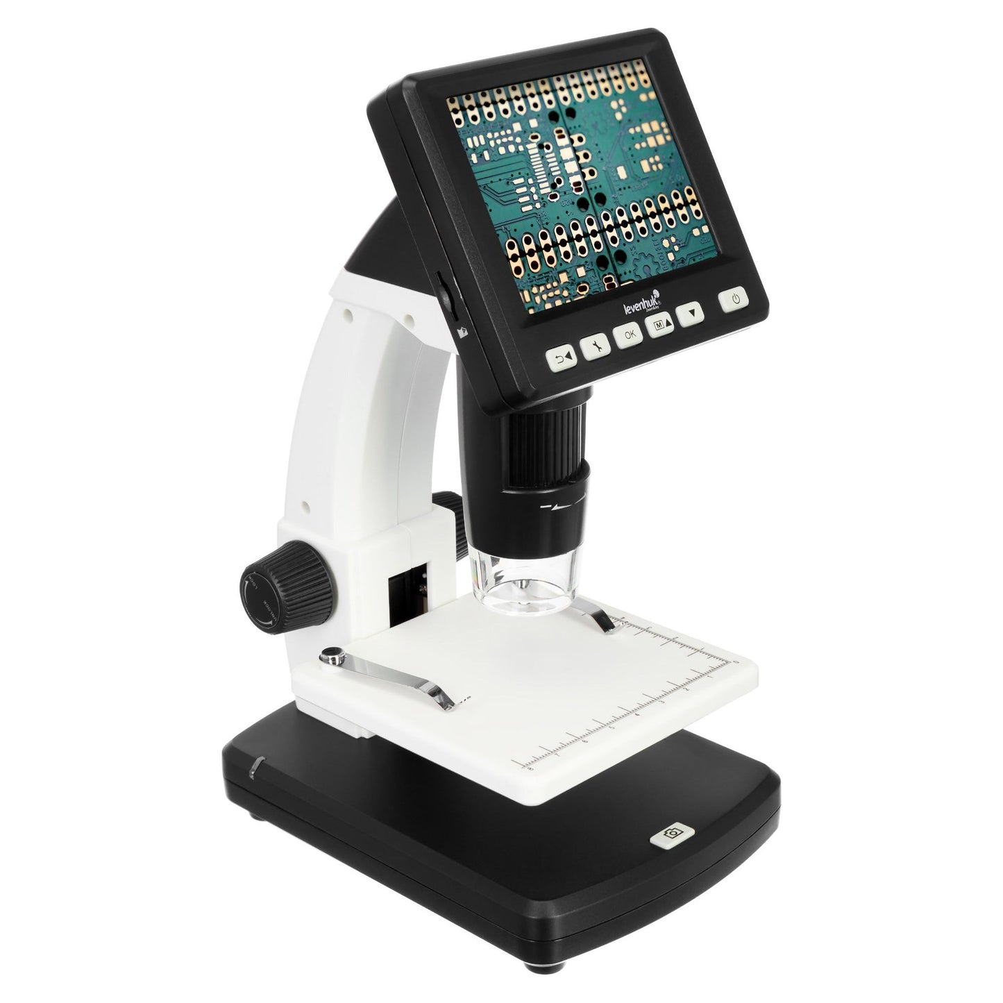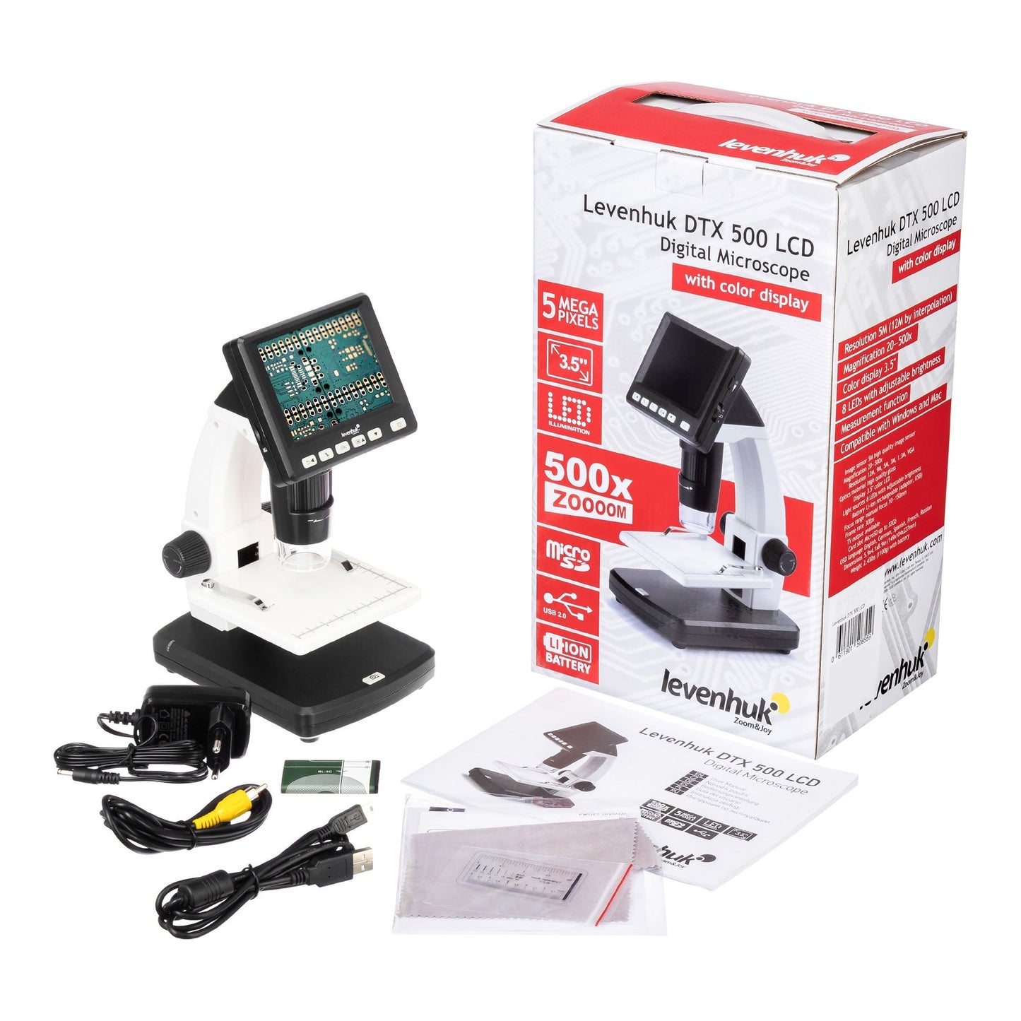 Levenhuk DTX 500 LCD-digitaalinen mikroskooppi, jossa on sisäänrakennettu 3,5 tuuman LCD-näyttö, mahdollistaa näytteiden tutkimisen 20-500-kertaisella suurennuksella ja työsi tulosten tallentamisen kuva- tai videomuodossa microSD-kortille. 8 sisäänrakennettua LED-valoa valaisevat tasaisesti työpinnan ja varmistavat minimaalisen energiankulutuksen. Valaistusjärjestelmässä on myös kirkkauden säätö.