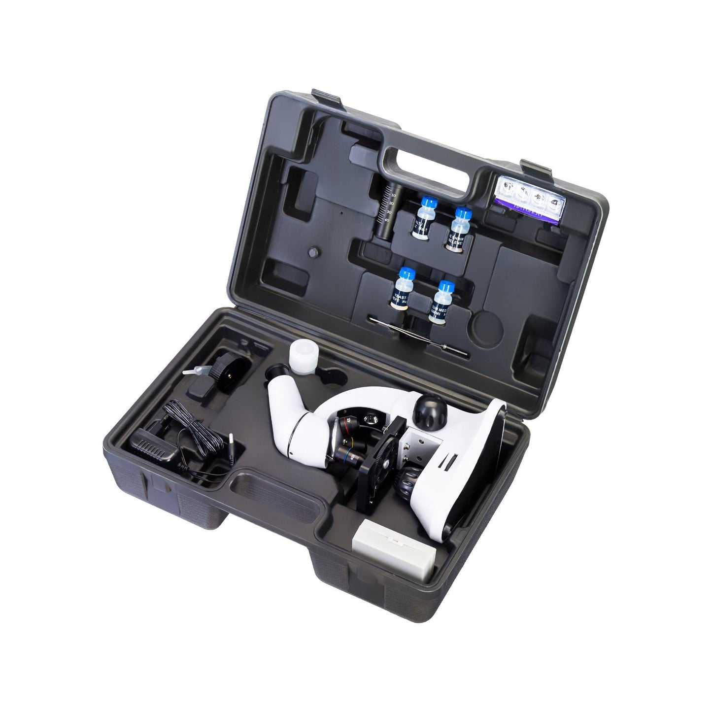 Pakkaukseen sisältyvän muovikotelon avulla voit pitää mikroskoopin ja kaikki tarvikkeet yhdessä paikassa, jotta mikään ei katoa. Se myös suojaa laitetta kuljetuksen aikana.