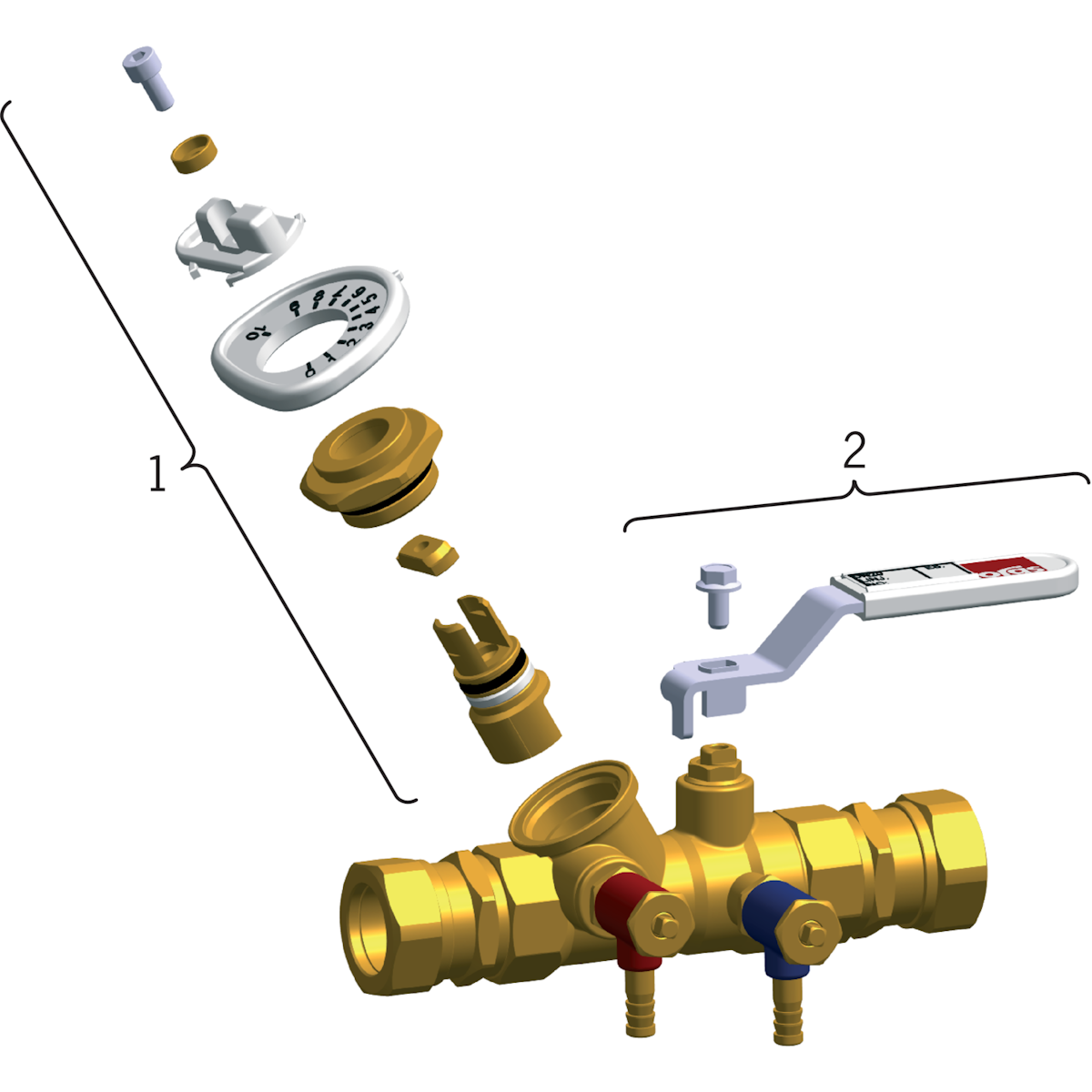 Kiertojohdon säätöventtiili pallosuluin ja mittausyhtein, varustettuna Cu-putken yhdistäjillä.