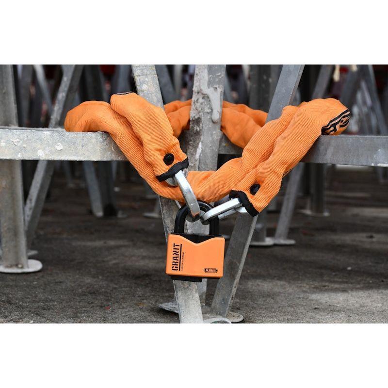Pakkaus sisältää 1 oranssin GRANIT 37/55 riippulukon, 1 ketjun 200 cm oranssilla nylonpäällyksellä ja 1 säilytyspussin (mustaa neopreenia) kiristysnyörillä. Säilytyspussissa on monitoiminto, mikä tarkoittaa, että se säilyttää setin piilossa, siirrettäessä ja lukittuna. Sen molemmissa päissä on aukko, mikä tarkoittaa, että lukko ja ketju vedetään pussin läpi ja suljetaan sitten lisäsuojalla naarmuja ja muita ulkoisia vaikutuksia vastaan.