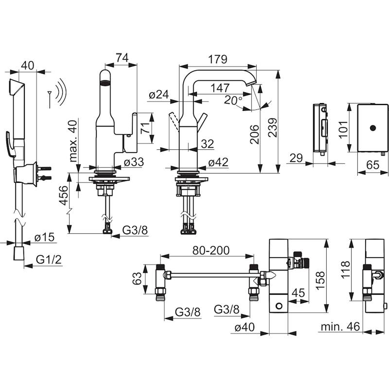 - vivun/kahvan tyyppi: yksi käyttövipu/kahva, puikkomainen vipu, kuuma/kylmä-symbolit