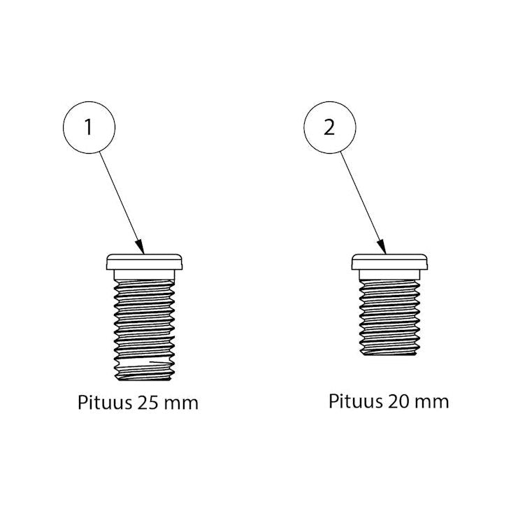 Koripohjaventtiilin ruuvit 1 kpl M12x20 mm ja 1 kpl M12x25 mm.