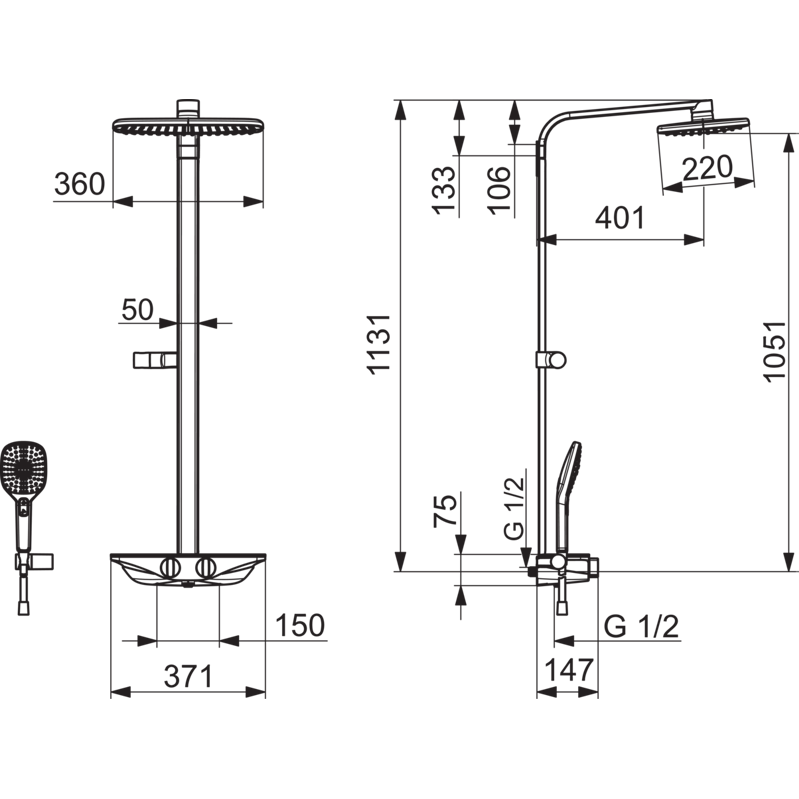 - suihkun osat: käsisuihku, sadesuihku/yläsuihku, suihkupidike, suihkuletku (1750 mm), nivelletty suihkulautanen