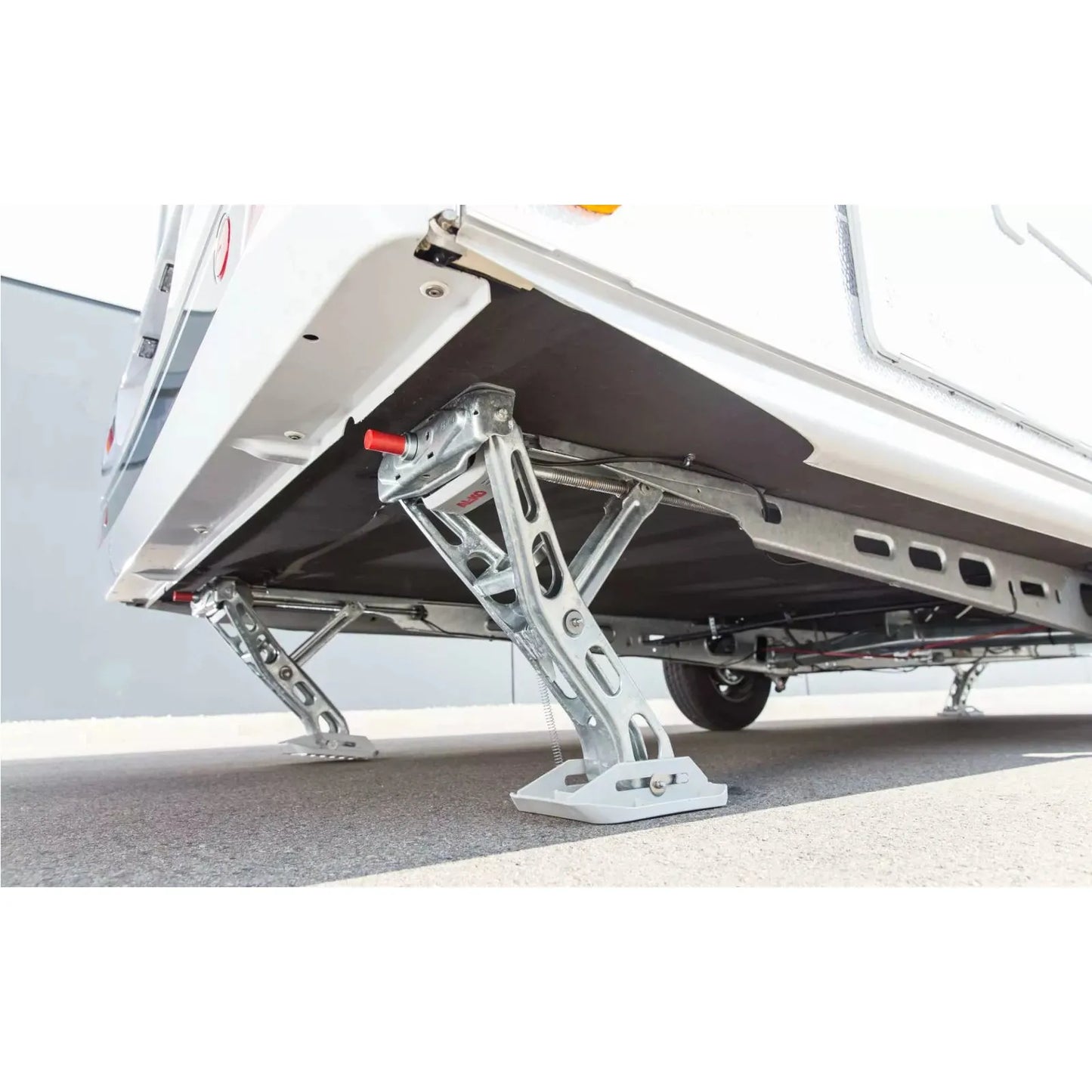 Kaikki 4 tukea on helppo laskea alas laadukkaan sähköisen käyttömoottorin avulla. Käytännöllistä: Järjestelmä soveltuu enintään 2,5 tonnin painoisiin matkailuvaunuihin, ja kuumasinkitys tarjoaa pitkäaikaisen korroossiosuojan. Sähkömoottori suojataan lisäksi muovisuojuksella. Tukien karan päät on suojattu varkaudelta, sillä niitä voidaan käyttää vain erikoisadapterilla. Sähköistä käyttöä ohjataan miellyttävästi kauko-ohjaimen painalluksella. Kun tuet on laskettu alas, niiden tasoa voidaan säätää erikseen. Ihanteellinen yhdistelmä: RANGER-siirtojärjestelmää voidaan ohjata samalla kauko-ohjaimella. Premium-tuet on varustettu AL-KOn BIG FOOT -jaloilla. Ne varmistavat tukevan asennon kaikilla retkeilyalueilla – ei luistoa eikä painumista. Tarkkaan harkittu: Ajon ajaksi tukijalka nostetaan ylös pohjan myötäisesti ja tilaa säästäen.