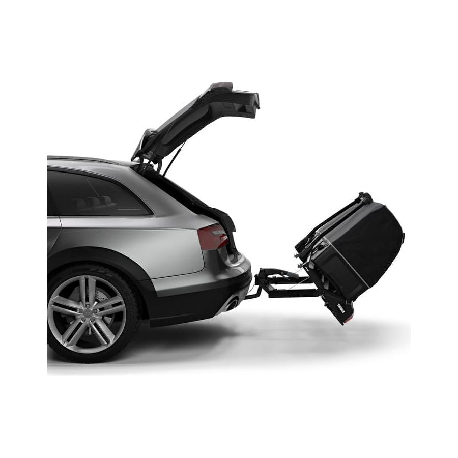 Tavaratilaan pääsee helposti käsiksi, koska laatikko asennetaan kallistettavaan Thule VeloSpace XT-telineeseen.